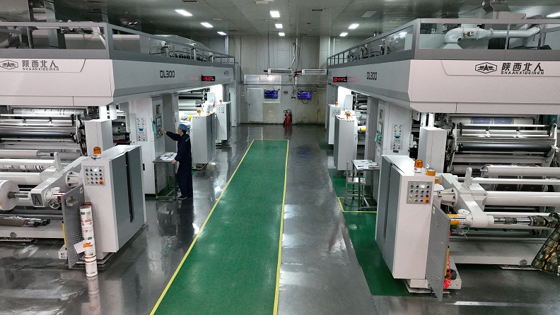 走进一家陕西北人客户的工厂,最先映入眼帘的,是两台陕西北人 DL300 系列干复机整齐列阵、协同作业的壮观画面。自DL300 系列干复机推出以来,凭借柔性涂胶、半悬浮烘箱、接近辊收料三大核心技术,重新定义了高效复合的标准,为众多客户带去了高速生产、极致能效与更低溶剂残留的全新体验。